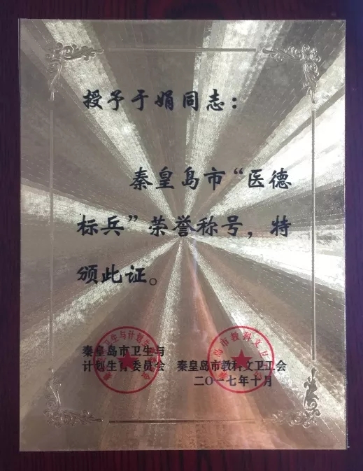 近年来,我市大力弘扬爱岗敬业、恪尽职守、尊重生命、乐于奉献、文明行医、全心全意为人民服务的道德风尚,经市医德标兵评选小组评审,市卫生和计划生育委员会、市科教科文工会决定,授予我院老年病科于娟主任“医德标兵”荣誉称号,于娟主任用自己的实际行动感动患者、呵护患者,为海医人争光!