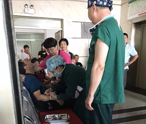 手术室内能够抽身的医护人员立即来到患者身边,看到患者浑身是汗倒在地上。在手术室主任张雪峰的指挥下,护士长和众护士从手术室内取来器材和药物为患者量血压、测脉搏、测血糖,并立即建立静脉通路、为他输液。