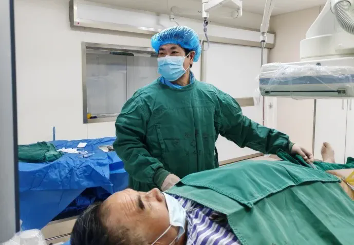 经过充分的术前检查和准备,手术定在了3月28日。当天一大早,张建军就赶到病房,陪伴张玉利进行手术。海港医疗集团党委书记、海港医院党总支书记张立欣也在术前专门来到导管室看望。上午8点50分左右,张玉利被推进导管室,市海港医院血管介入科主任陈金龙为他实了介入微创手术。不到半个小时,手术顺利完成。简单地活动一下后,张玉利自己走出了导管室