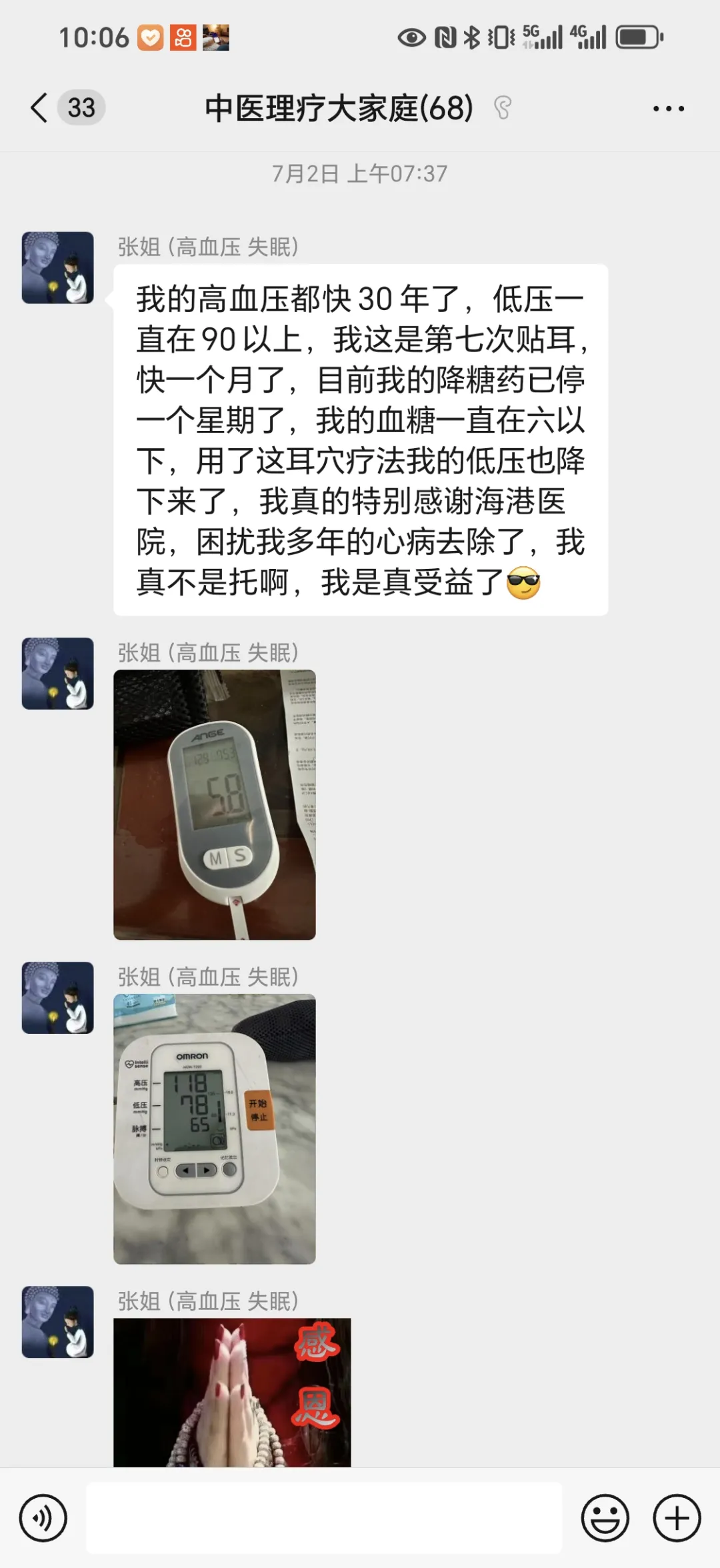 令人惊喜的是,仅仅贴压一个月,张女士便感受到了身体明显的变化。她开始根据自身状况调整用药。在血压控制方面,原本居高不下的血压显著下降,高压也稳定在了较为理想的范围内。多年来,她一直被高血压问题所困扰,各种降压药物效果都不理想,而海医耳穴贴压疗法却让她的血压得到了明显改善,这让她倍感欣喜。